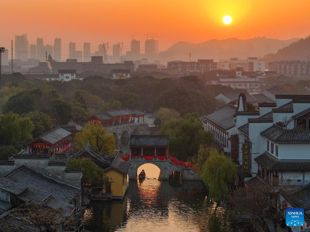 An aerial drone photo shows the sunrise scenery at Anchang ancient town in Shaoxing City, east China's Zhejiang Province, Jan. 1, 2025. [Photo by Gao Piaoran/Xinhua]