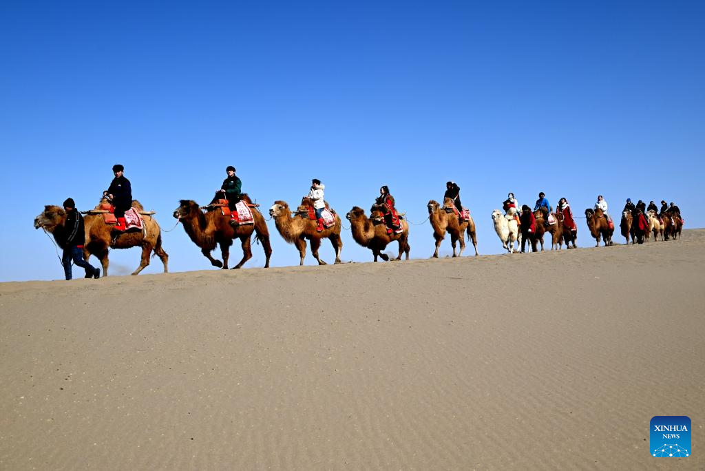 Tourists enjoy a camel ride at the Mingsha Mountain and Crescent Spring scenic spot in Dunhuang, northwest China's Gansu Province, Feb 23, 2025. [Photo by Zhang Xiaoliang/Xinhua]