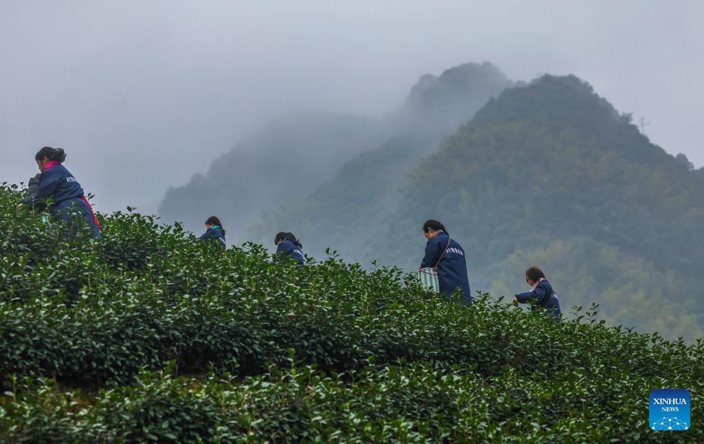 Farmers pick tea leaves at a tea garden in Wangzhai Town of Wuyi County, Jinhua City, east China's Zhejiang Province, March 5, 2025. As spring unfolds, tea gardens across Wuyi County have entered the harvest season.