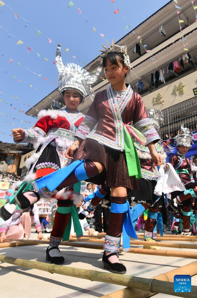 Students perform bamboo pole dance at a primary school in Rongshui Miao Autonomous County of Liuzhou City, south China's Guangxi Zhuang Autonomous Region, March 25, 2025. [Xinhua/Huang Xiaobang]