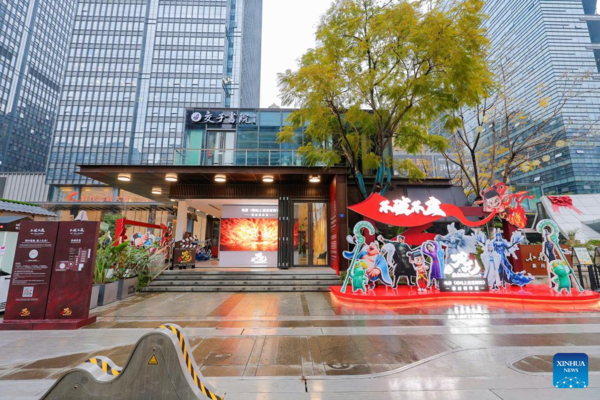 | This photo taken on March 3, 2025 shows a view outside an exhibition on the creative journey of Chinese animated blockbuster "Ne Zha 2" in Chengdu, southwest China's Sichuan Province. [Xinhua/Tong Fang] |