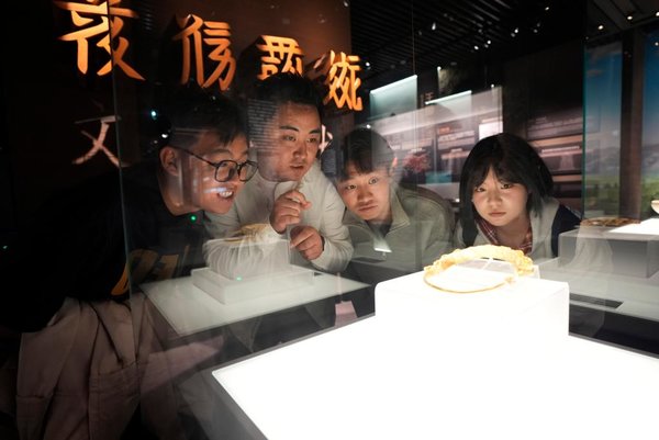 | Members of a team which designs and makes cultural and creative products study an exhibit at Xixia Imperial Tombs Museum in Yinchuan, northwest China's Ningxia Hui Autonomous Region, April 23, 2025. [Xinhua/Wang Peng] |