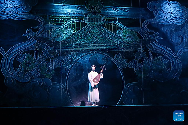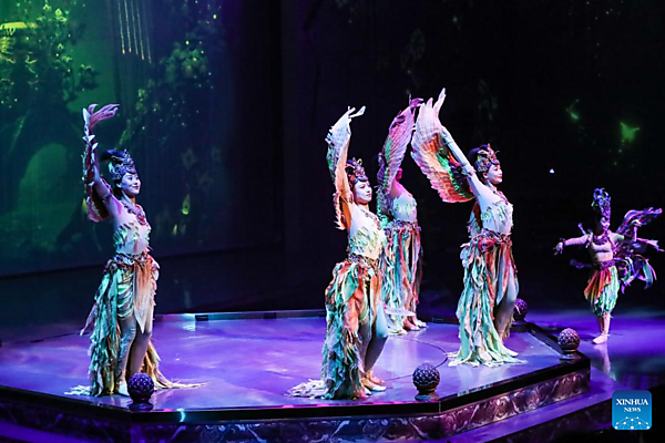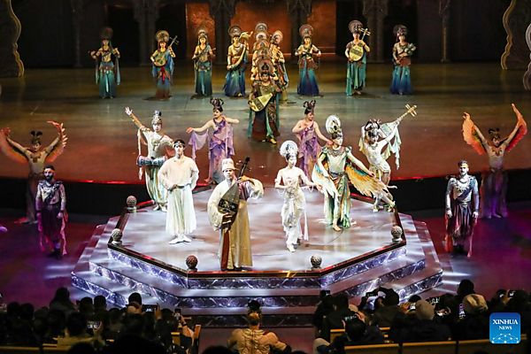 An immersive dance drama "Ancient Sound of Dunhuang" is staged in Dunhuang, northwest China's Gansu Province, Dec. 15, 2025. Blending elements drawn from the murals and sculptures of Dunhuang, the performance features elaborately designed stage, holographic display, and awe-inspiring dance. [Xinhua/Lang Bingbing] |