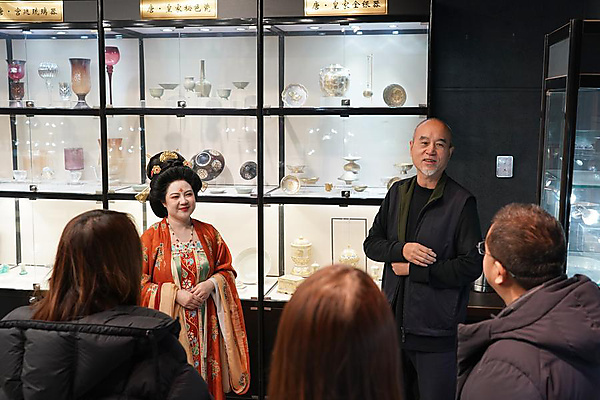 | Li Huan (2nd L) and tea culture expert Wang Miao (2nd R) tell stories about tea sets in Tang Dynasty (618-907 AD) to tourists at a museum in Xi'an, northwest China's Shaanxi Province, Jan. 9, 2026. [Xinhua/Shao Rui] |