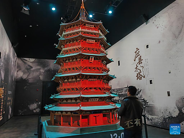 | A visitor views an exhibit at an ancient Chinese architecture exhibition themed "Black Myth: Wukong" in Taiyuan, north China's Shanxi Province, on Jan. 14, 2026. [Xinhua/Xie Yuan] |