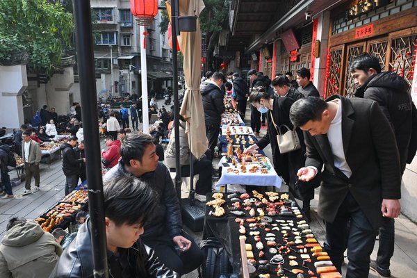 | People purchase Shoushan stone carving products at a market in Fuzhou, southeast China's Fujian Province, March 8, 2025. [Xinhua/Jiang Kehong] |