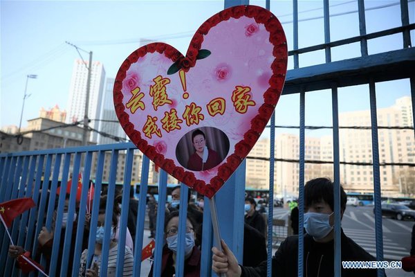 A man shows a welcome cardboard written to his girlfriend, one of the medics supporting virus-hit Hubei Province, in Lanzhou, northwest China's Gansu Province, March 22, 2020. The third batch of medical assistance team supporting Hubei from Gansu, which consists of 147 members, returned home on Sunday as the epidemic situation in Hubei has been greatly eased. [Xinhua/Du Zheyu]