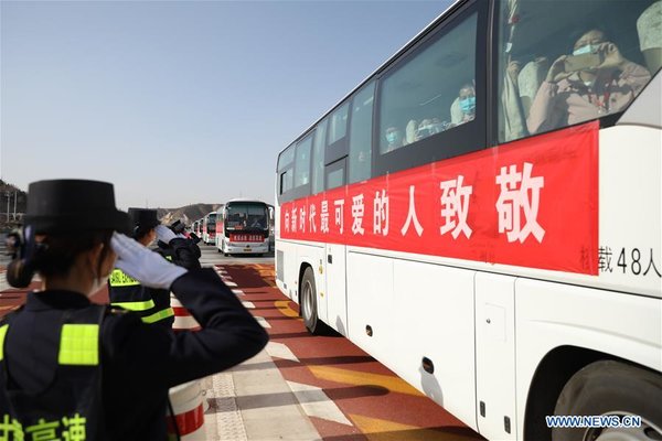Medics supporting virus-hit Hubei Province take buses to designated places for quarantine after their arrival at the Lanzhou Zhongchuan International Airport in Lanzhou, northwest China's Gansu Province, March 22, 2020. The third batch of medical assistance team supporting Hubei from Gansu, which consists of 147 members, returned home on Sunday as the epidemic situation in Hubei has been greatly eased. [Xinhua/Du Zheyu]