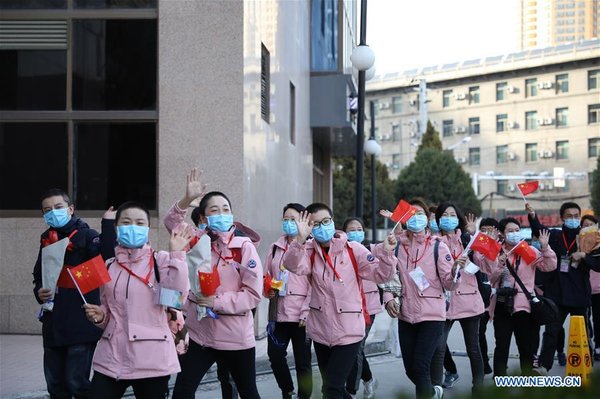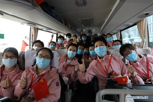 Medics supporting virus-hit Hubei Province arrive at a designated place for quarantine in Lanzhou, northwest China's Gansu Province, March 22, 2020. The third batch of medical assistance team supporting Hubei from Gansu, which consists of 147 members, returned home on Sunday as the epidemic situation in Hubei has been greatly eased. [Xinhua/Du Zheyu]