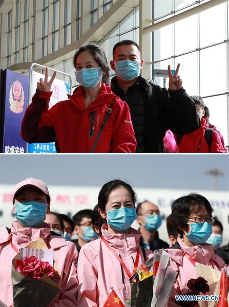 Combo photo shows a medic (L) prepares to board a plane for Wuhan of Hubei Province at Zhongchuan International Airport in Lanzhou, northwest China's Gansu Province, Feb 19, 2020 (up) and the medic (C) arrives at the Lanzhou Zhongchuan International Airport in Lanzhou, northwest China's Gansu Province, March 22, 2020, after accomplishing her mission in Wuhan. The third batch of medical assistance team supporting Hubei from Gansu, which consists of 147 members, returned home on Sunday as the epidemic situation in Hubei has been greatly eased. [Xinhua/Du Zheyu]