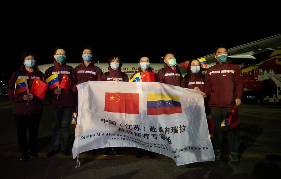 | Chinese medical experts pose at the Simon Bolivar International Airport, in La Guaira, Venezuela, on March 30, 2020. China has sent a team of medical experts to Venezuela to help the country fight the COVID-19 pandemic. [Xinhua/Marcos Salgado] |
