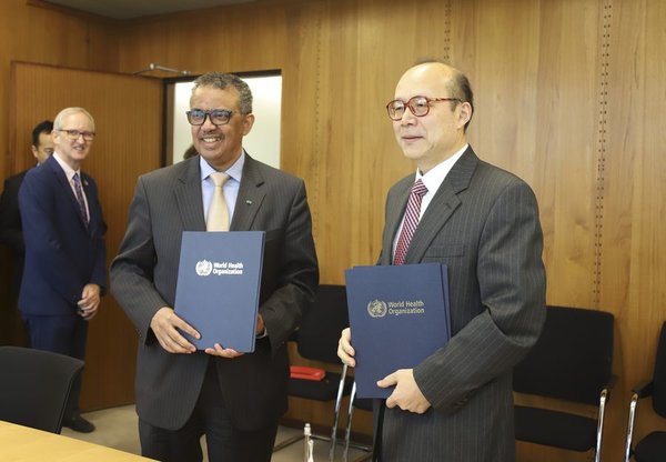 | World Health Organization (WHO) Director-General Tedros Adhanom Ghebreyesus (2nd R) poses for a photo with Chen Xu (1st R), China's permanent representative to the United Nations Office at Geneva, after signing an agreement on China's donation of 20 million U.S. dollars to the WHO for cooperation in dealing with the novel coronavirus epidemic, in Geneva, Switzerland, on March 10, 2020. [Xinhua/Liu Qu] |