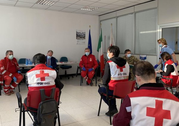 | Chinese medical team experts talk with local doctors and Red Cross staff members in Padua, Italy, March 17, 2020. [Xinhua/Qin Xiaoli] |