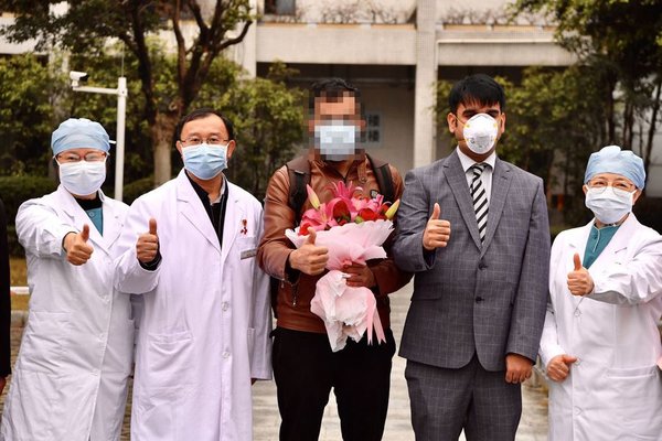 | A Pakistani student (C) studying in China poses for photos with medical staff after his recovery at Guangzhou 8th People's Hospital in Guangzhou, south China's Guangdong Province, February 12, 2020. [Xinhua/Wang Yan] |
