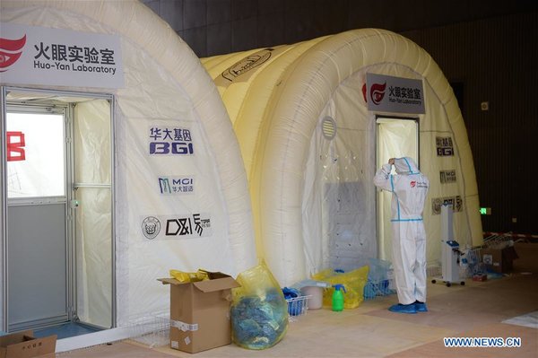 A COVID-19 testing lab built with an air-inflated structure went into trial operation on Monday at a sports venue in Daxing District of Beijing to address the city's rising demand for nucleic acid tests after a cluster of infections were confirmed recently. The mobile Huoyan (Fire Eye) laboratory was built in two days over the weekend to accommodate 14 automated COVID-19 testing machines provided by Chinese biotech company BGI Genomics based in the city of Shenzhen, south China's Guangdong Province.