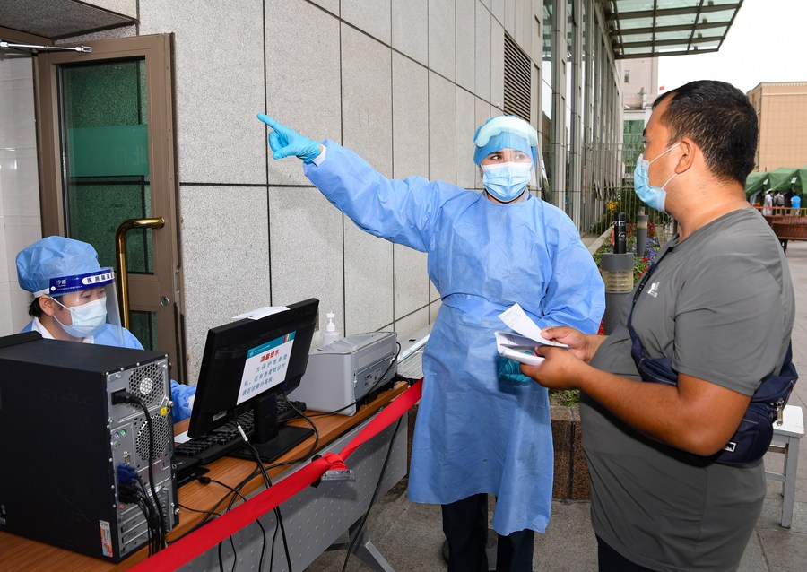 A staff member provides guidance to a man at a hospital in Urumqi, northwest China's Xinjiang Uygur Autonomous Region, July 21, 2020. [Xinhua/Song Yanhua]