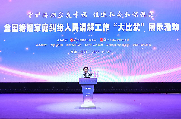 The National Finals and Showcase of People's Mediation Skills Competition for Marriage and Family Disputes, hosted by the All-China Women's Federation (ACWF) and the Ministry of Justice, was held in Changsha, capital of Central China's Hunan Province, from November 26-27, 2025. Huang Xiaowei, Vice-President and First Member of the Secretariat of the ACWF, attended and delivered a speech.