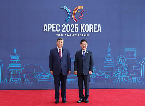 | Chinese President Xi Jinping is warmly greeted by South Korean President Lee Jae-myung upon his arrival for the first session of the 32nd Asia-Pacific Economic Cooperation (APEC) Economic Leaders' Meeting in Gyeongju, South Korea, Oct. 31, 2025. The first session of the 32nd APEC Economic Leaders' Meeting kicked off in Gyeongju, South Korea, on Friday. Xi attended the meeting and delivered a speech titled "Building an Inclusive Open Asia-Pacific Economy for All." [Xinhua/Huang Jingwen] |