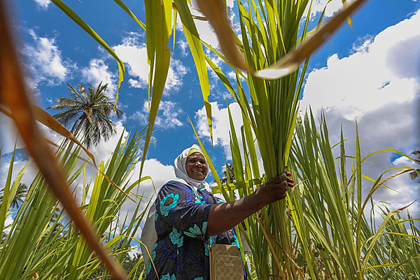 | Tanzanian dairy farmer Tahiya Bauso Massawe works in her Juncao grass field in Zanzibar, Tanzania, Sept. 19, 2025. [Xinhua/Emmanuel Herman] |