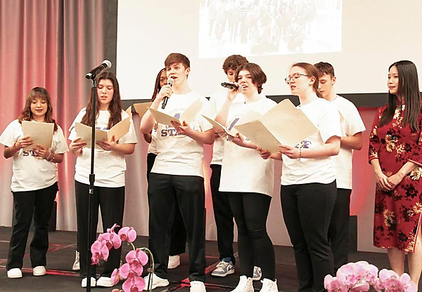 | Students from Muscatine High School sing a song in Chinese at a reception marking the 45th anniversary of the establishment of China-U.S. diplomatic relations in Chicago, the United States, Feb. 27, 2024. [Xinhua/Xu Jing] |