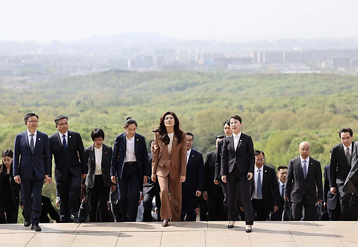 | Cheng Li-wun, chairwoman of the Chinese Kuomintang (KMT) party, leads a KMT delegation to pay homage to the Sun Yat-sen Mausoleum in Nanjing, east China's Jiangsu Province, April 8, 2026. [Xinhua/Xing Guangli] |