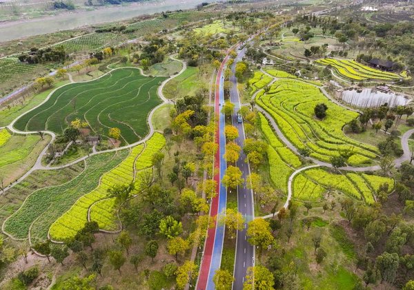 | An aerial drone photo shows fields of cole flowers at Guangyang Isle in southwest China's Chongqing, March 16, 2024. [Xinhua/Wang Quanchao] |