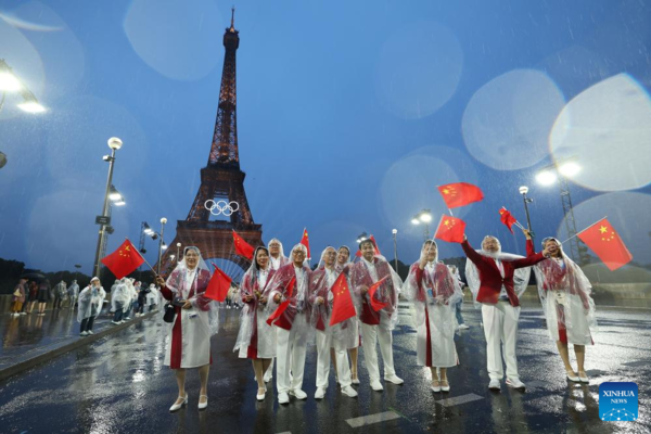 | Members of the Chinese delegation are seen during the opening ceremony of the Paris 2024 Olympic Games in Paris, France, July 26, 2024. [Xinhua/Guo Yu] |