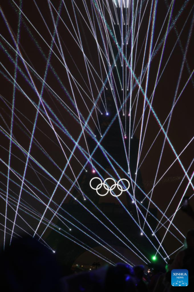 | A light show is seen at the Eiffel Tower during the opening ceremony of the Paris 2024 Olympic Games in Paris, France, July 26, 2024. [Xinhua/Shen Bohan] |