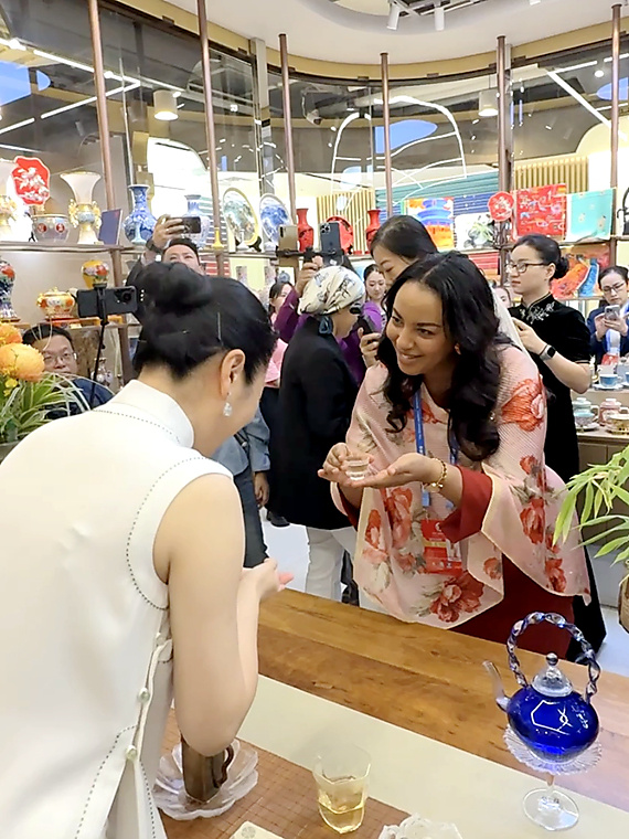| Guests watch a Chinese-tea-culture performance in the Silk Street building. |
