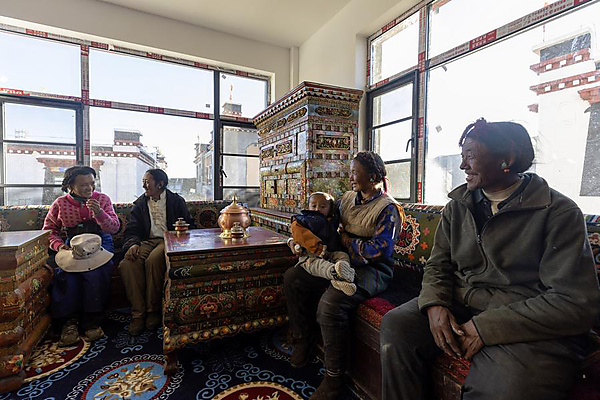 | A villager (2nd L) hosts neighbors in her new house in Gyabug Village of Dingri County, Xigaze City, southwest China's Xizang Autonomous Region, Oct. 24, 2025. [Xinhua/Jiang Fan] |
