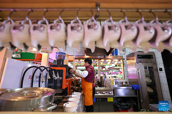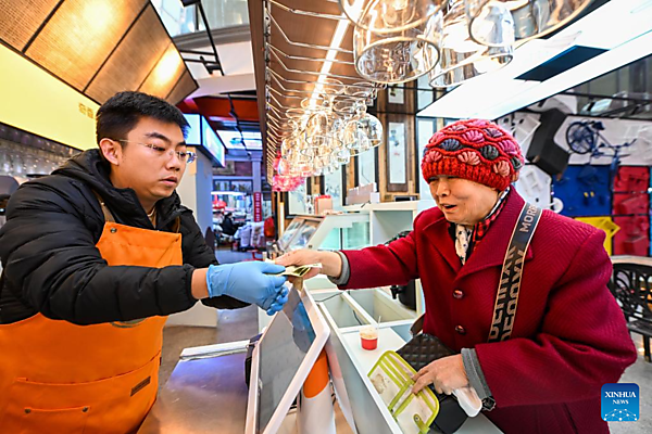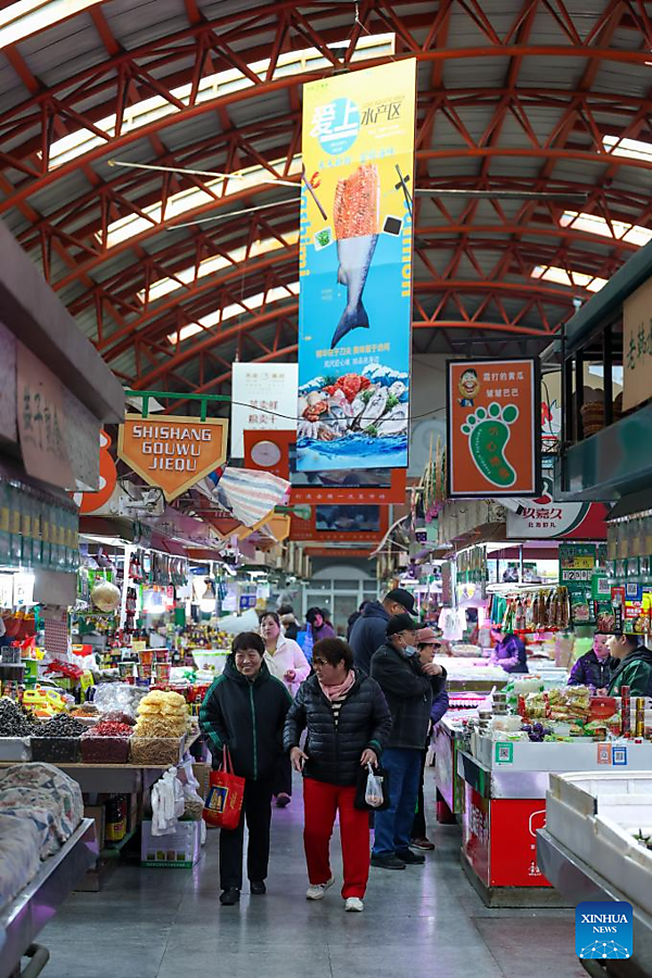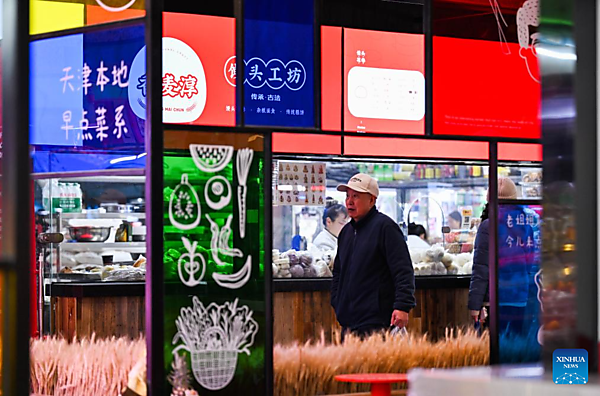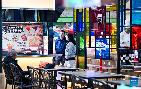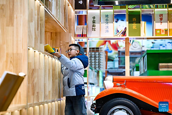 | People have fun at a reading room at Sanshui grocery market in Hexi District of Tianjin, north China, Nov. 25, 2025. With reading room, coffee outlet and grocery stalls brought under the same roof, Sanshui market, a traditional shopping place of more than 20 years old, was given a new life when it went through a refurbishing project and opened to business again in September this year. Thanks to the newly added scenarios, Sanshui is no longer a mere source of daily necessities to the over 30,000 residents in 13 surrounding communities, but also a space to spend their leisure time in. The renewal of this grocery market is just one of the many vivid examples of Hexi District's efforts to improve amenities for the local residents. To date, the district is home to 46 "15-minute circles of daily convenience," where local residents are able to meet their daily needs within a 5-minute walk and access quality services within a 15-minute walk. [Xinhua/Zhao Zishuo] |