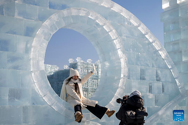 | A tourist poses for photos at the Harbin Ice-Snow World in Harbin, northeast China's Heilongjiang Province, Dec. 17, 2025. [Xinhua/Zhang Tao] |