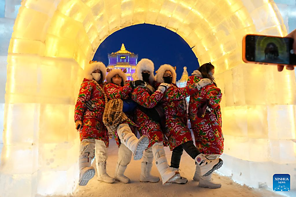 | Tourists pose for group photos at the Harbin Ice-Snow World in Harbin, northeast China's Heilongjiang Province, Dec. 17, 2025. [Xinhua/Wang Jianwei] |