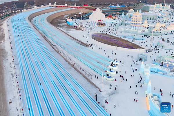 | An aerial drone photo taken on Dec. 17, 2025 shows tourists visiting the Harbin Ice-Snow World in Harbin, northeast China's Heilongjiang Province. [Xinhua/Zhang Tao] |