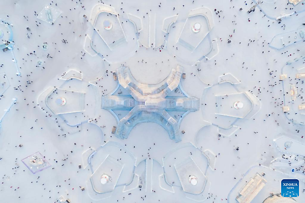 | An aerial drone photo taken on Dec. 17, 2025 shows the ice sculptures at the Harbin Ice-Snow World in Harbin, northeast China's Heilongjiang Province. [Xinhua/Wang Song] |