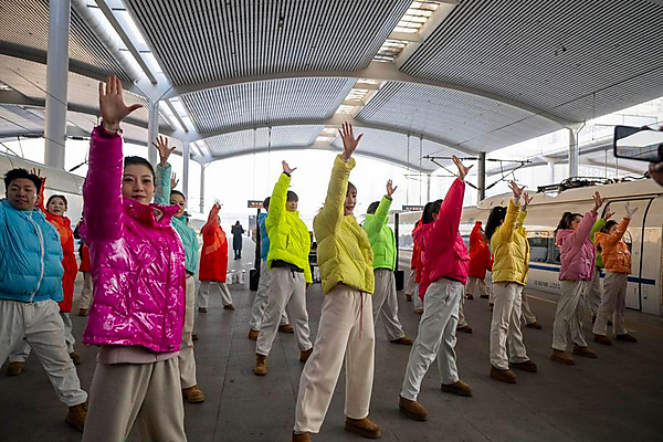 | Performers dance outside the bullet train No.G1276, the first themed high-speed train of the Harbin Ice-Snow World, at Harbin West Station in Harbin, northeast China's Heilongjiang Province, Jan. 4, 2026. [Xinhua/Zhang Tao] |