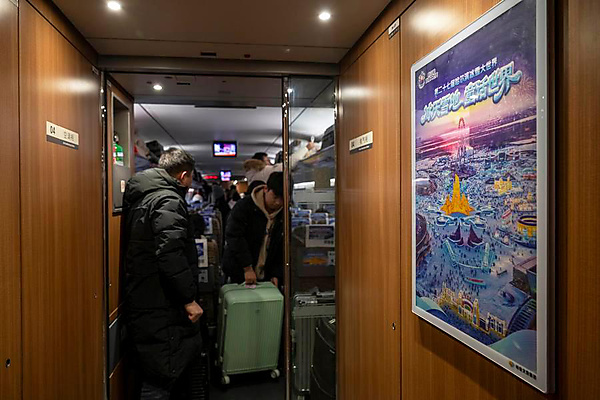 | Passengers put luggage in place on the bullet train No.G1276, the first themed high-speed train of the Harbin Ice-Snow World, Jan. 4, 2026. [Xinhua/Zhang Tao] |
