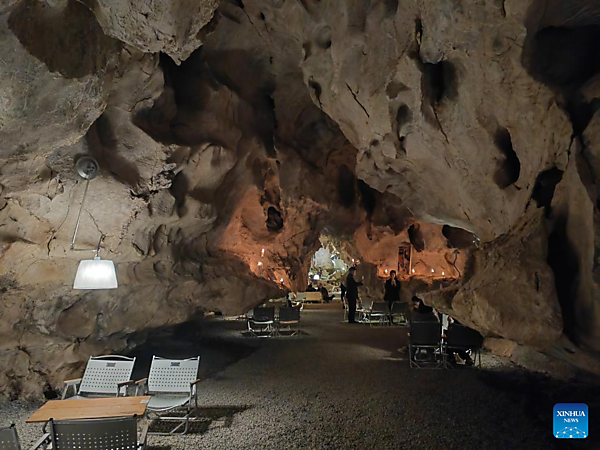 | This photo taken on Nov. 23, 2025 shows an interior view of Xiu Café, a coffeehouse built inside a natural karst cave in Xiuwen County, southwest China's Guizhou Province. [Xinhua/Wu Si] |