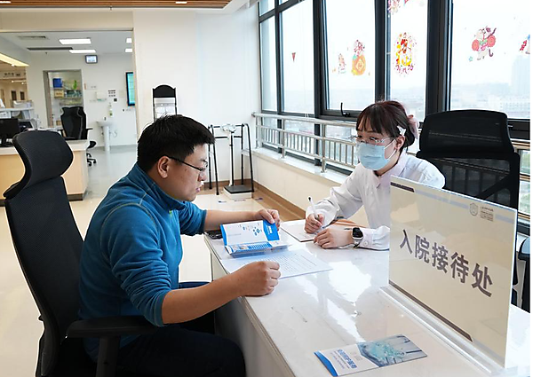 | A nurse (R) explains the "companion-free" care services to a family member of an inpatient at a hospital in Shanghai, east China, Feb. 26, 2026. [Xinhua/Liu Ying] |