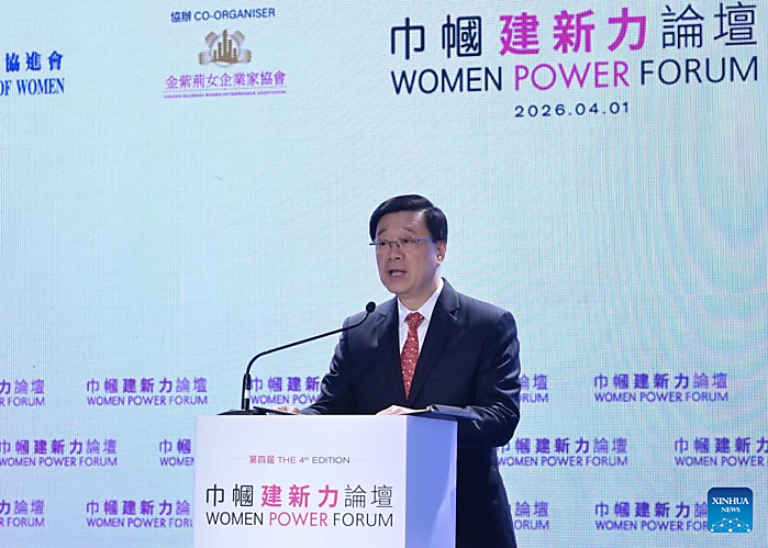 | John Lee, chief executive of the Hong Kong Special Administrative Region, speaks at the opening ceremony of the 4th Women Power Forum in Hong Kong, south China, April 1, 2026. The 4th Women Power Forum held here on Wednesday convened 380 representatives from 27 countries worldwide for dialogues on pushing women's progress. [Xinhua] |