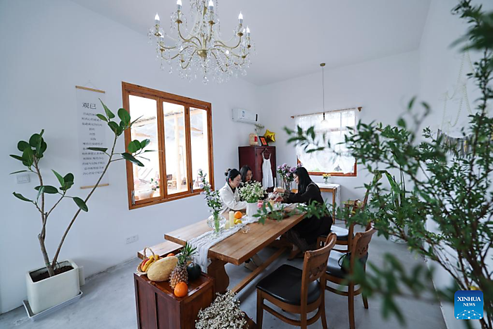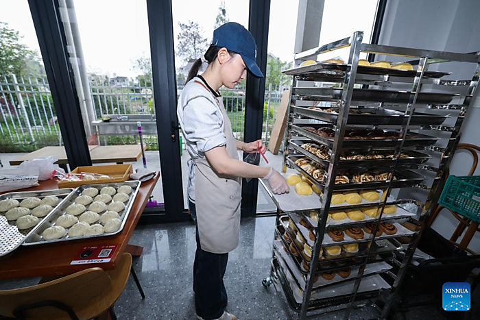 | Zhu Jun (1st L), head of a shared vegetable garden, leads visitors to experience agricultural work in a field in Fengqiao Town, Nanhu District of Jiaxing City, east China's Zhejiang Province, April 8, 2026. In recent years, Nanhu District of Jiaxing City has been providing policy support, platform building, and industry incubation for returning young entrepreneurs, along with low-cost startup spaces, attracting hundreds of young people to start businesses in their hometown. These young entrepreneurs, equipped with internet thinking, modern business logic, and innovative business models, have transformed fields and farmhouses into cultural and tourism offerings. They have introduced trendy elements such as art markets, kiln-baked bread, rural cafes, pet socializing, and educational workshops into the countryside, helping villagers promote and sell specialty agricultural products and boosting local incomes. [Xinhua/Xu Yu] |