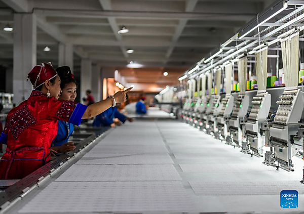 | Long Luying (2nd R) talks with tourists at the workshop in Shibing County of Qiandongnan Miao and Dong Autonomous Prefecture, southwest China's Guizhou Province, Oct. 10, 2025. In an embroidery workshop in Shibing County, Long Luying and her colleagues wield needles as pens and thread as ink to embroider motifs such as flowers, birds, fish, and butterflies, resulting in Miao embroidery works with vibrant and lifelike patterns. Long Luying is a provincial-level inheritor of Miao embroidery, having learned the craft from her mother during her childhood. In 2006, she left her job at an embroidery workshop in Shenzhen and returned to her hometown in Shibing County where she launched her own business focused on handmade Miao embroidery. Over the years, Long Luying has provided free training in embroidery techniques to local women, creating job opportunities for more than 1,200 rural women in the village. [Xinhua/Tao Liang] |