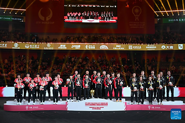 | Gold medalists team China pose during the awarding ceremony at the ITTF Mixed Team World Cup 2025 in Chengdu, southwest China's Sichuan Province, Dec. 7, 2025. [Xinhua/Wang Ying] |