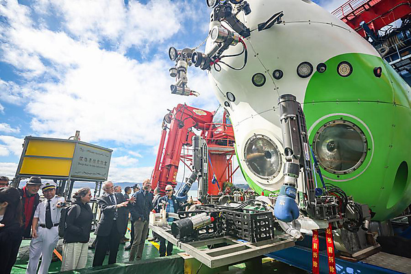 | People look at deep-sea manned submersible Fendouzhe (Striver) aboard Tansuo-1 research vessel during a Concluding Open Day of a joint China-New Zealand dive expedition in Wellington, New Zealand, March 21, 2025. [Xinhua/Long Lei] |