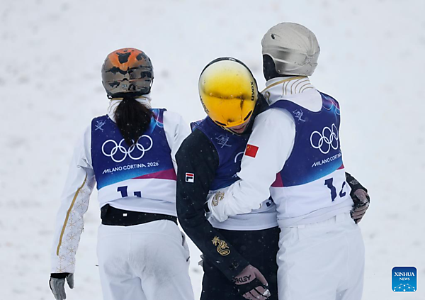| Wang Xindi (C) of China comforts teammate Li Tianma (L) at the freestyle skiing mixed team aerials final 2 at the Milan-Cortina 2026 Olympic Winter Games in Livigno, Italy, Feb. 21, 2026. [Xinhua/Wang Peng] |
