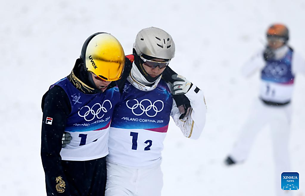 | Xu Mengtao and Li Tianma (R) of China react after the freestyle skiing mixed team aerials final 2 at the Milan-Cortina 2026 Olympic Winter Games in Livigno, Italy, Feb. 21, 2026. ([Xinhua/Hu Chao] |