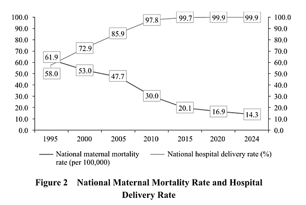 Since 2012, the national hospital delivery rate has remained above 99 percent, and in 2024, the systematic maternal management rate reached 94.9 percent. The maternal mortality rate has dropped by 76.9 percent, from 61.9 per 100,000 in 1995 to 14.3 per 100,000 in 2024 – far below the global average.