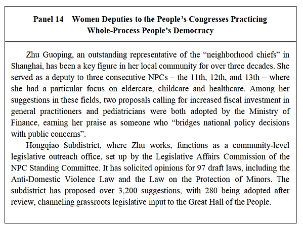 Exercising state power through the people's congresses. The proportion of women in people's congresses at all levels continues to rise. In the 14th NPC convened in 2023, there were 790 women deputies, accounting for 26.5 percent of the total. This represents an increase of 3.1 percentage points from the 12th NPC and 1.6 percentage points from the 13th NPC. At the county and township levels, women constitute 31.64 percent and 32.36 percent of deputies, respectively. These women deputies fulfill their duties in accordance with the law, soliciting and reflecting public opinion from all sectors of society. Between 2018 and 2025, NPC women deputies put forward 29,328 suggestions, criticisms and opinions, accounting for 42.3 percent of the total.