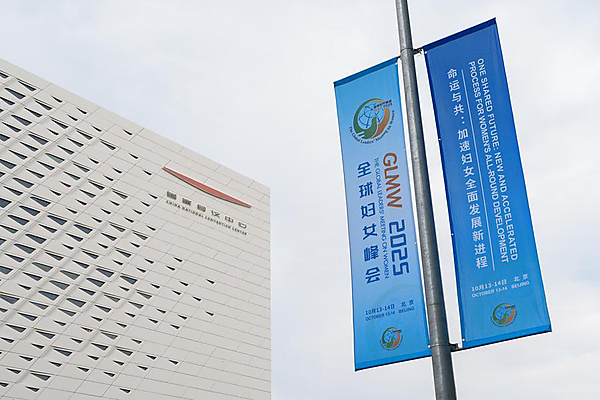 Street banners for the Global Leaders' Meeting on Women are pictured in Beijing, capital of China, on Oct. 11, 2025. [Xinhua/Ju Huanzong] |