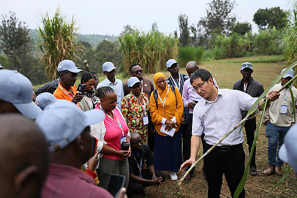 Chinese Juncao expert Lin Hui explains to trainees at the China-Rwanda Agriculture Technology Demonstration Center in Huye District, Rwanda, on July 17, 2025. [Photo by Huang Wanqing/Xinhua] |